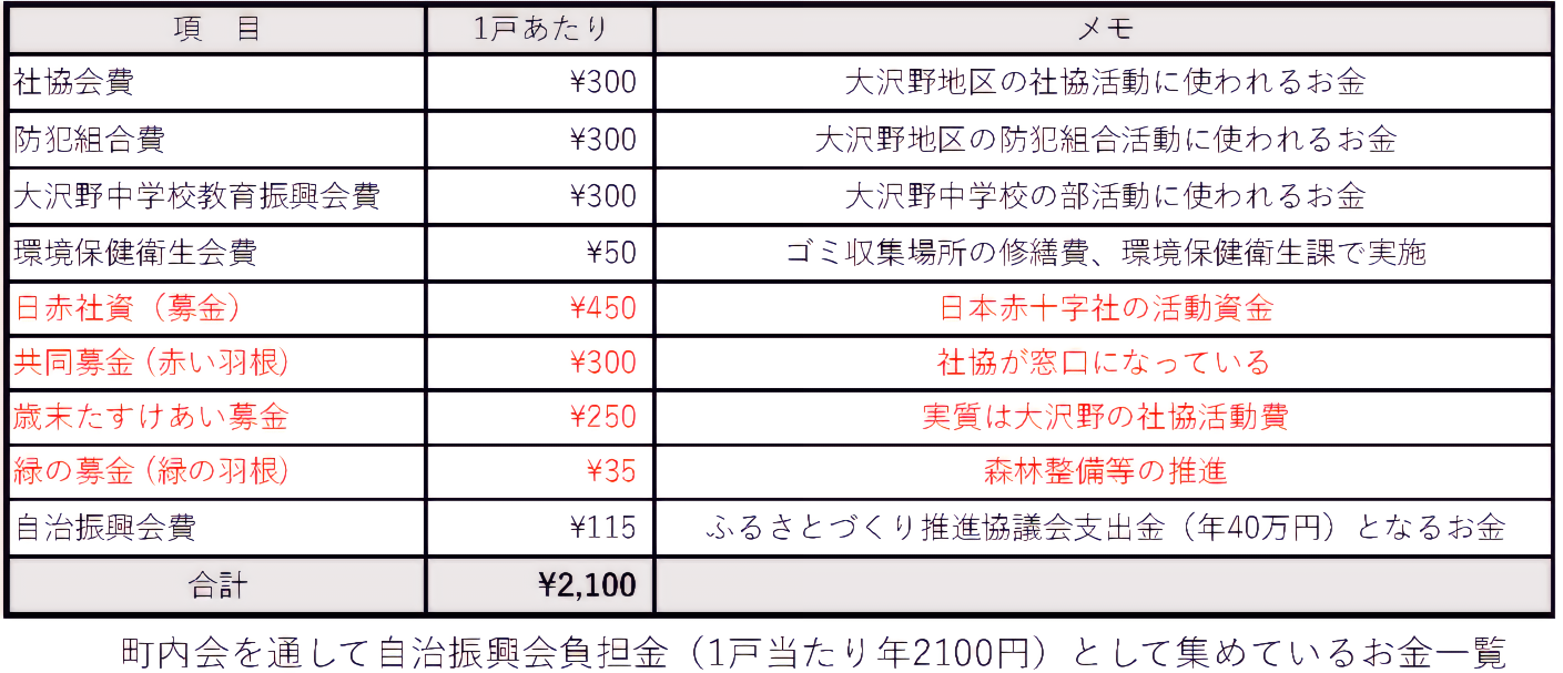 ⾃治振興会負担⾦の⾒直しで今回対象となったのは「募⾦」と名のつくものだけです。「⼤沢野中学校教育振興会費」「社協会費」の徴収根拠の問題、さらに「⾃治振興会費」という名で集められたお⾦のほぼ全てが「ふるさとづくり推進協議会」に渡っている点にも問題が指摘されています。しかし、これらは“会費”と名乗っている以上、会⻑の権限だけで⼀⽅的に廃⽌することはできません。まず主催団体が、まるで税⾦のように全⼾から徴収してきた根拠と正当性を住⺠に説明し、そのうえで住⺠の意⾒を広く伺って判断すべきだと考えています。